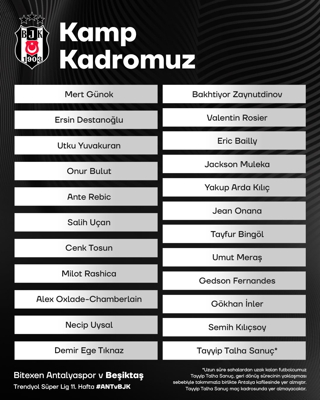 Trendyol Süper Lig'in 11. haftasında Antalyaspor'a konuk olacak Beşiktaş'ta kamp kadrosu belli oldu.